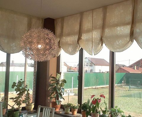 Ключевая особенность таких штор: скручивается наверх и подвязывается завязками, из того же материала что и сама штора. Похоже на римскую, но специального карниза для этой шторы не требуется.